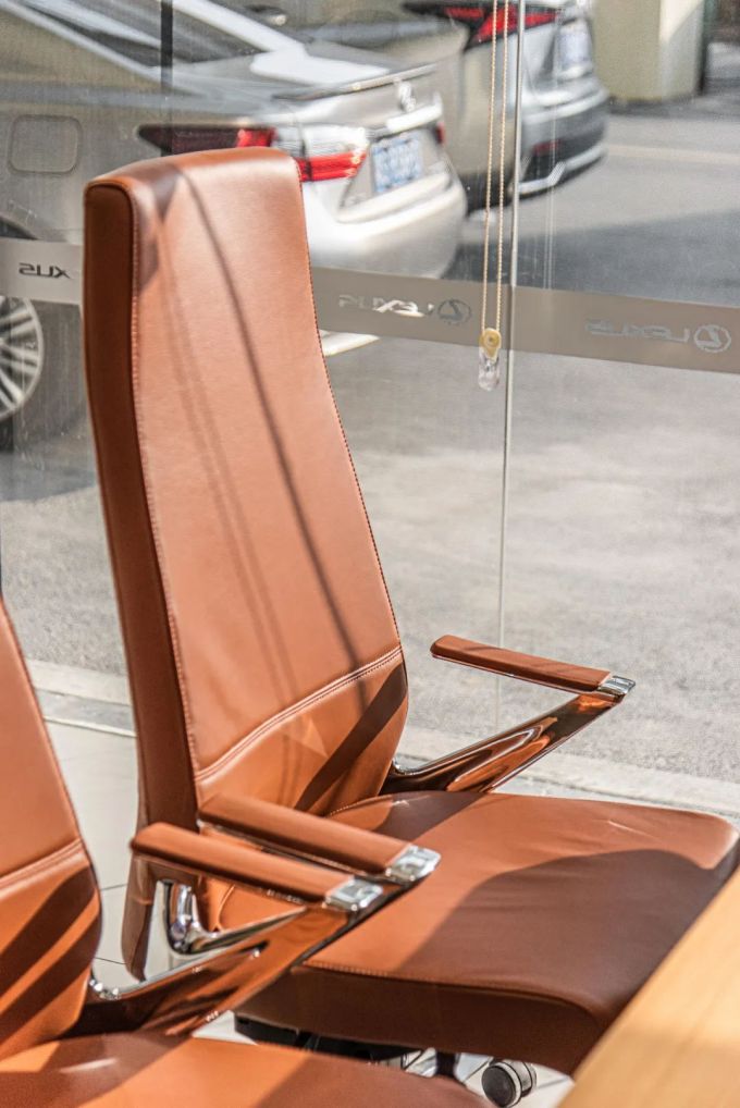 从视觉情绪上,皮椅的橘棕配色舒缓柔和,大气内敛,在一定程度上缓和了销售服务中心的严肃氛围。