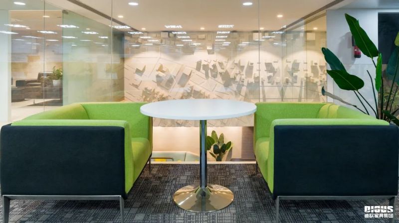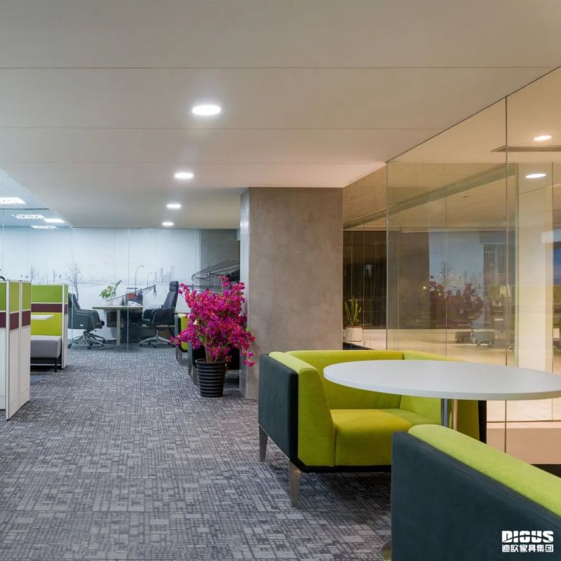 办公区的旁边预留了休憩空间,可供员工交流和讨论。清新的布艺沙发组合与屏风办公桌的色系保持统一,营造静谧舒适的氛围,使人在忙碌喧闹的工作中暂时抽离。
