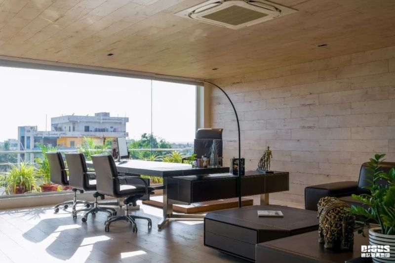 独立办公室在选材和造型上,更强调家具的实用性、艺术质感和舒适度。在Director's cabin整个办公区域内不仅设置有办公桌椅、还有沙发、展示柜,无论是处理工作还是会客谈事,均可在此完成。